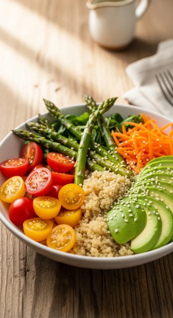 This vibrant bowl combines fresh spring veggies with protein-packed quinoa for a hearty yet light meal.