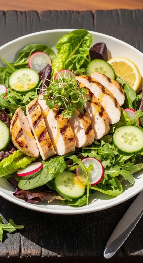 3. Slice chicken and toss with mixed greens, cucumber, and radishes.