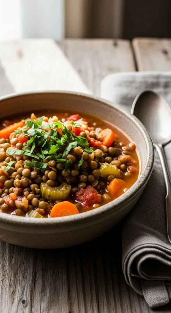2. Add lentils, tomatoes, and broth; simmer 25–30 minutes until lentils are tender.