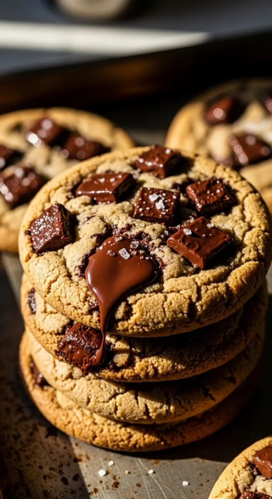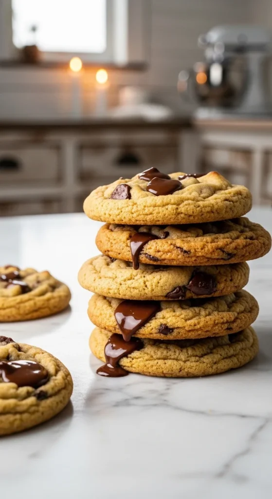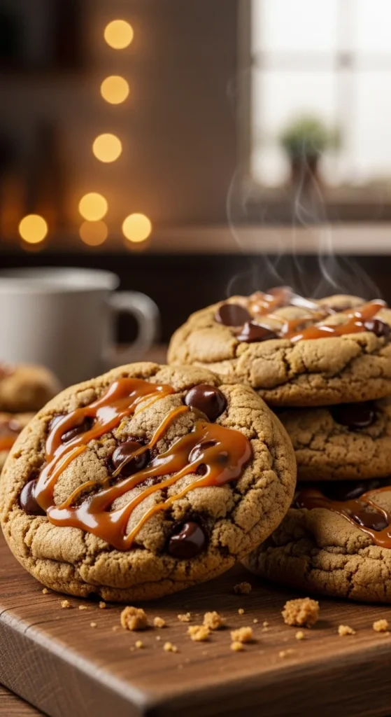 [Image Prompt: thick cookies with melted caramel pockets and chocolate chips, gooey texture visible, warm golden color, cozy kitchen setting.]