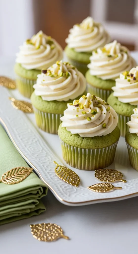 Soft, nutty, and pretty in pastel green — these pistachio cupcakes add a touch of elegance.