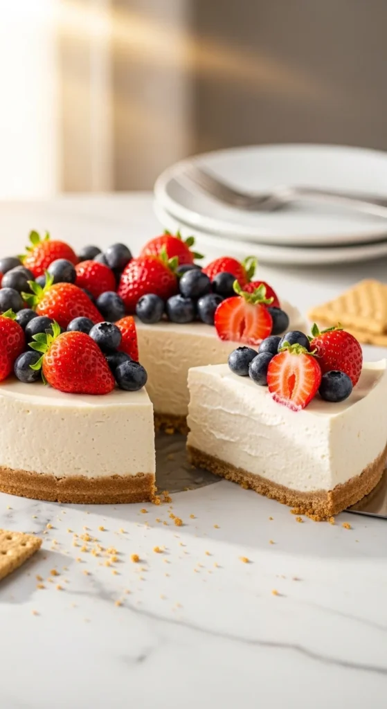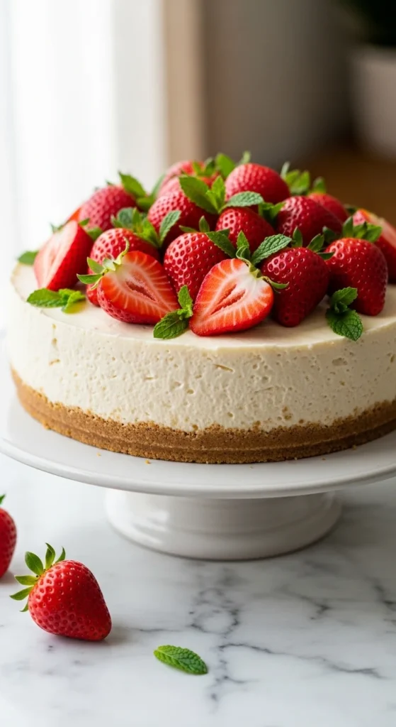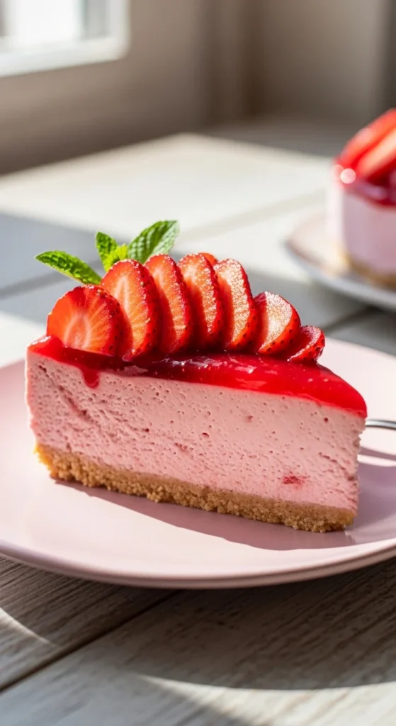 Sweet strawberries give this cheesecake a fruity twist that feels fresh and bright.