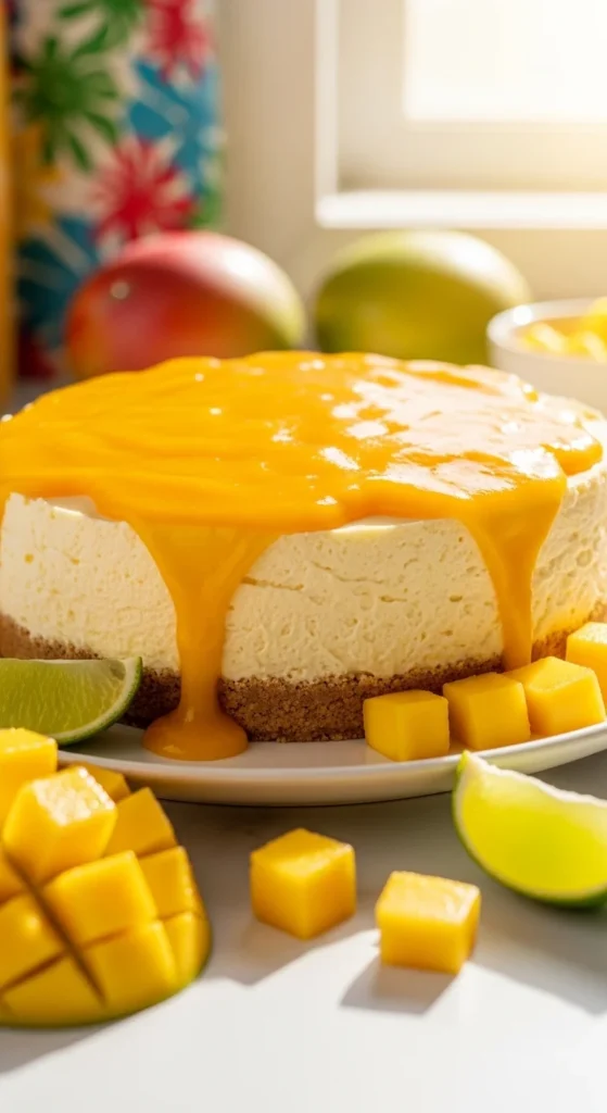 Sweet mango gives this cheesecake a tropical dessert flavor.