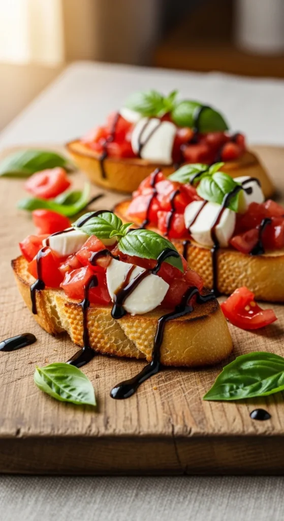 - Top toasted baguette slices with tomatoes, mozzarella, and basil.