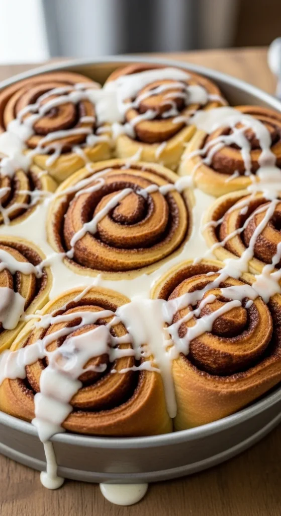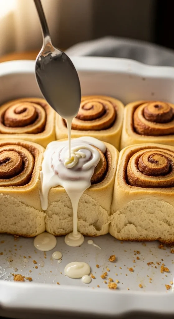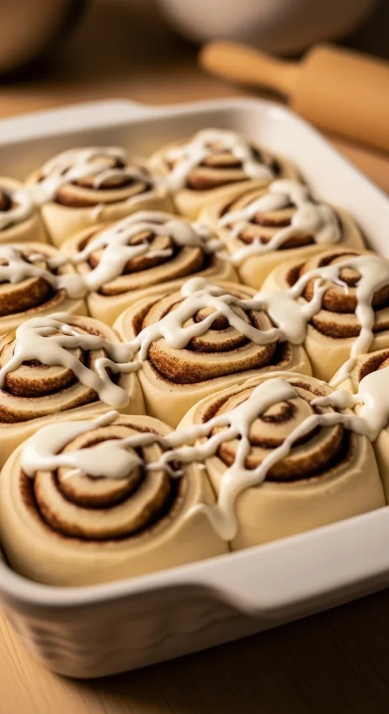 Once baked, let them cool for a few minutes before drizzling with glaze — because no cinnamon roll is complete without that creamy topping.