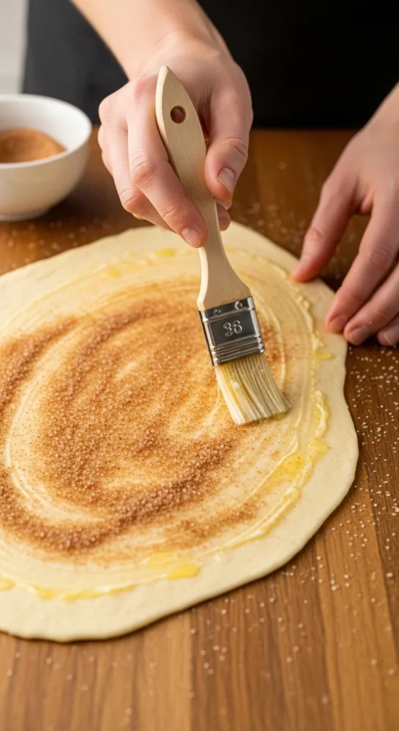 - Spread the filling: Brush the dough with melted butter, then sprinkle the brown sugar-cinnamon mixture evenly across the surface.