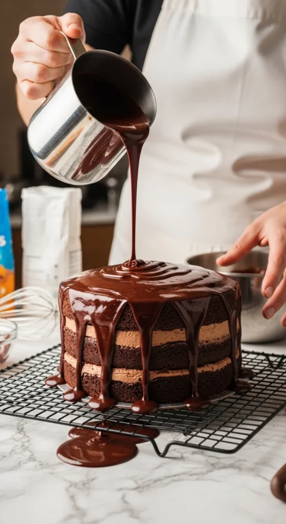 When your cake or dessert is ready, place it on a wire rack with parchment underneath. Pour the ganache slowly over the center and let it flow naturally down the sides. Don’t overwork it — the less you touch, the smoother the finish.