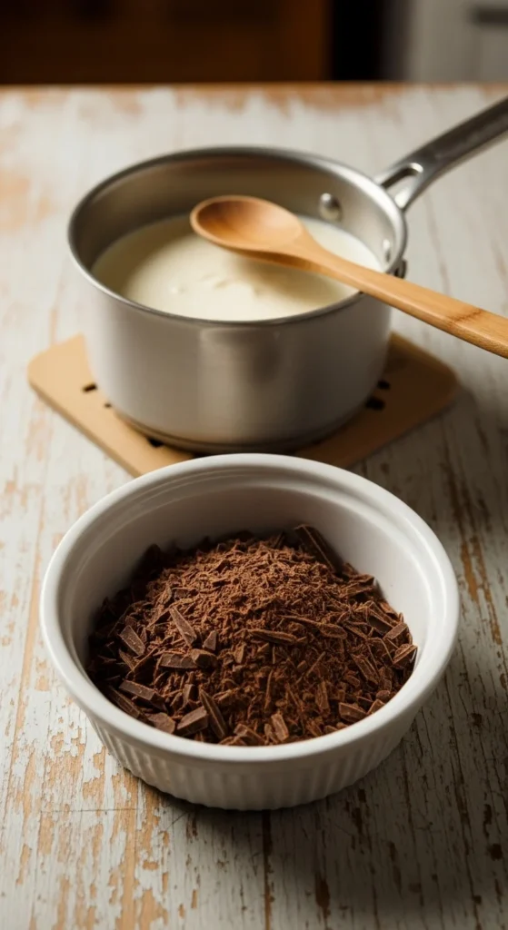 Pour the hot cream over the chopped chocolate in a heatproof bowl. Let it sit undisturbed for 2–3 minutes to allow the chocolate to soften.