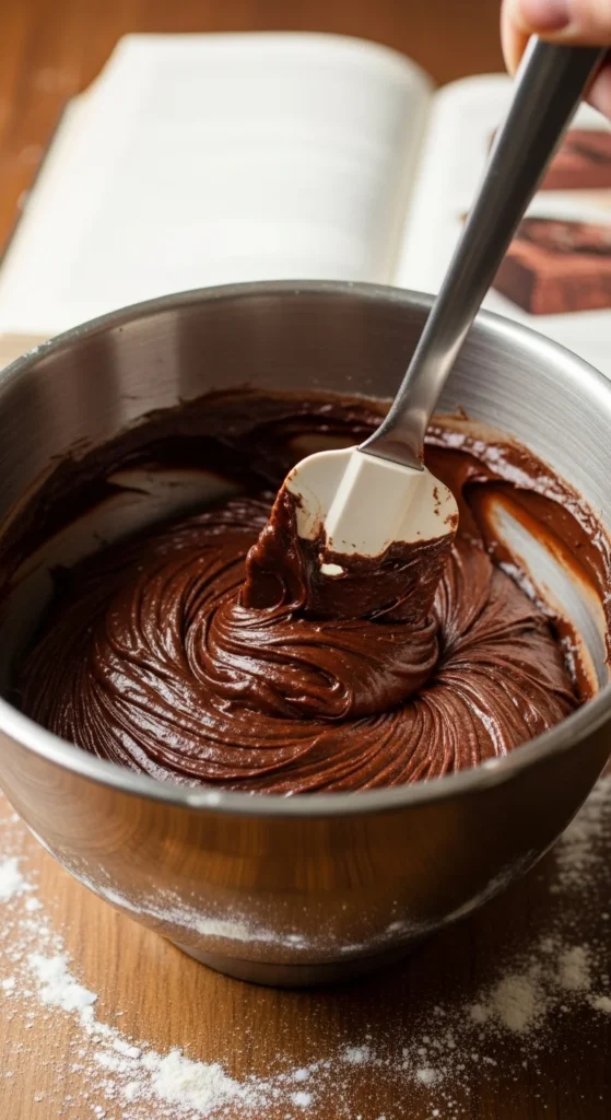Gently fold these dry ingredients into your wet mixture. Don’t overmix — stop as soon as there are no visible streaks of flour. Overmixing leads to cakey brownies.