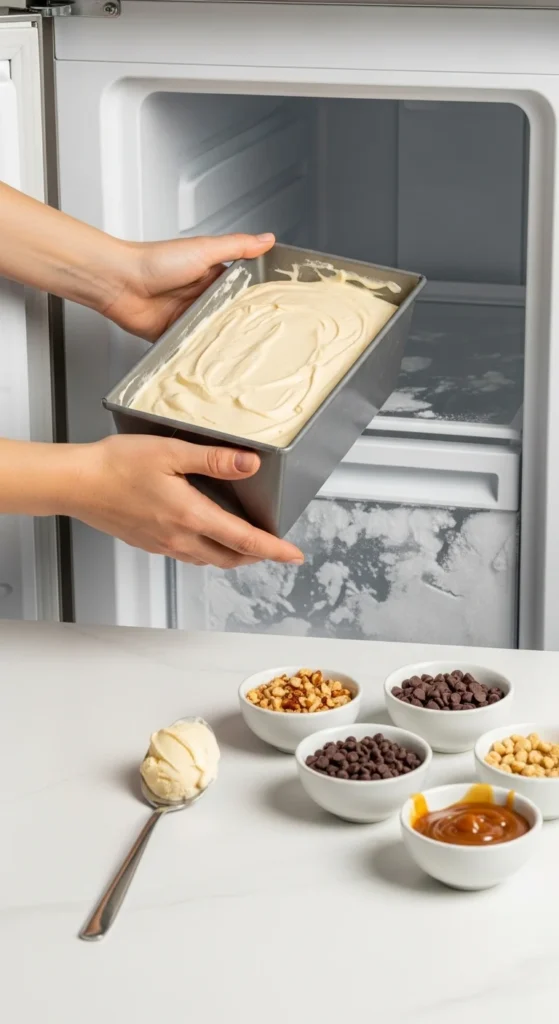 Once your mixture is ready, pour it into a loaf pan or freezer-safe container. Smooth out the top, cover with plastic wrap or a lid, and freeze for at least 6 hours — or overnight for best results.