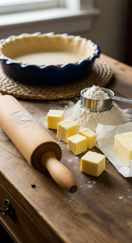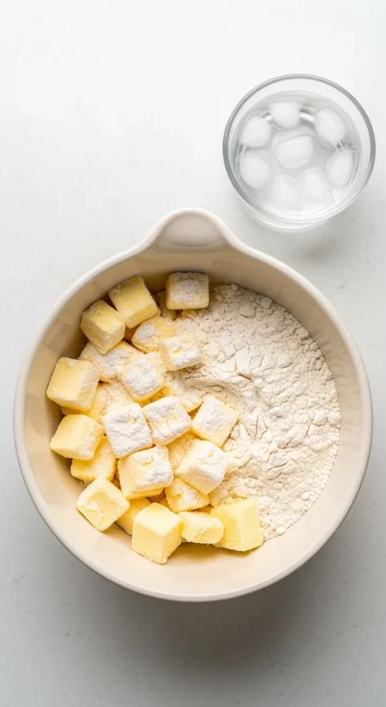 A flaky crust starts with simple, cold ingredients. The key is temperature — keeping everything cold ensures layers of butter form flaky pockets when baked.