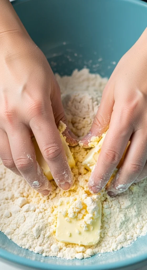 You’re aiming for a shaggy texture — some small bits of butter should still be visible. These will create those lovely flaky layers once baked.