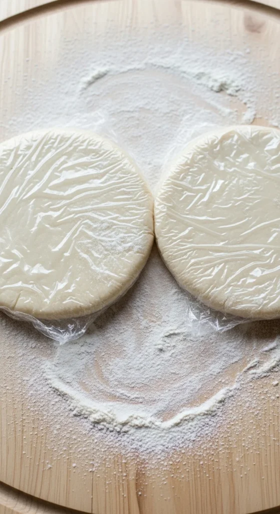 Gather the dough into a ball, then divide it in half if you’re making a double crust. Flatten each portion into a disk, wrap in plastic wrap, and chill for at least 1 hour.