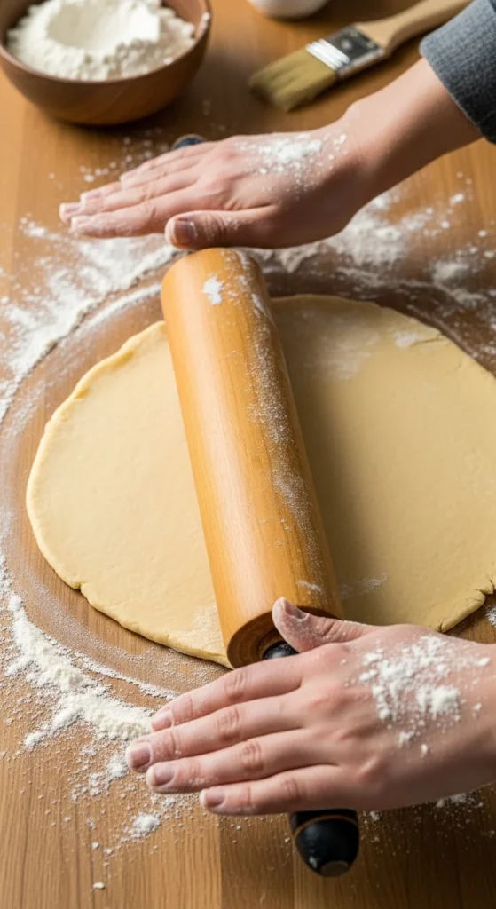 If it sticks, sprinkle a bit more flour — but don’t overdo it, or your crust can become tough. Aim for about ⅛-inch thickness.