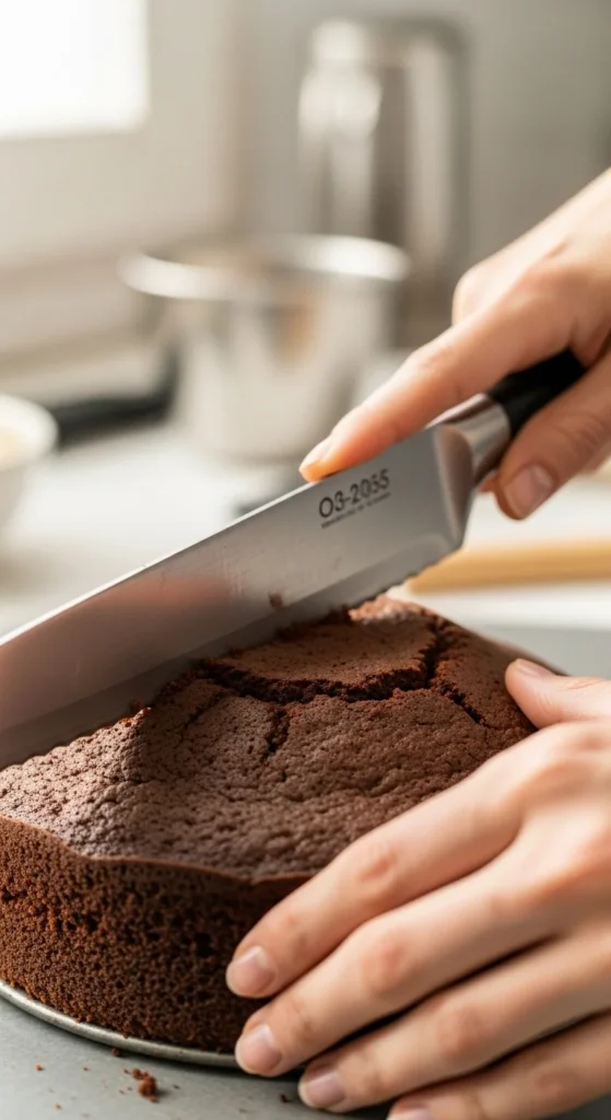 • Chill slightly. Pop the layers into the fridge for 20–30 minutes to firm them up — it’ll make leveling easier and less messy.