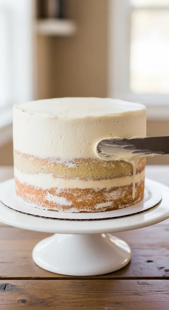 Before diving into final decoration, always apply a crumb coat — a thin layer of frosting that locks in loose crumbs.