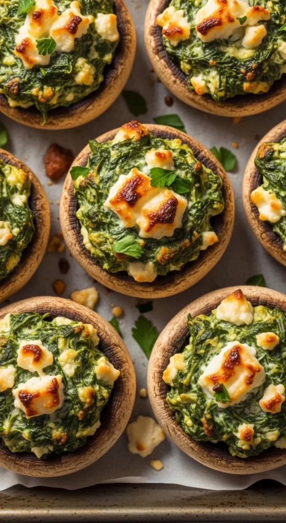 - Mix spinach and feta, stuff into mushrooms.