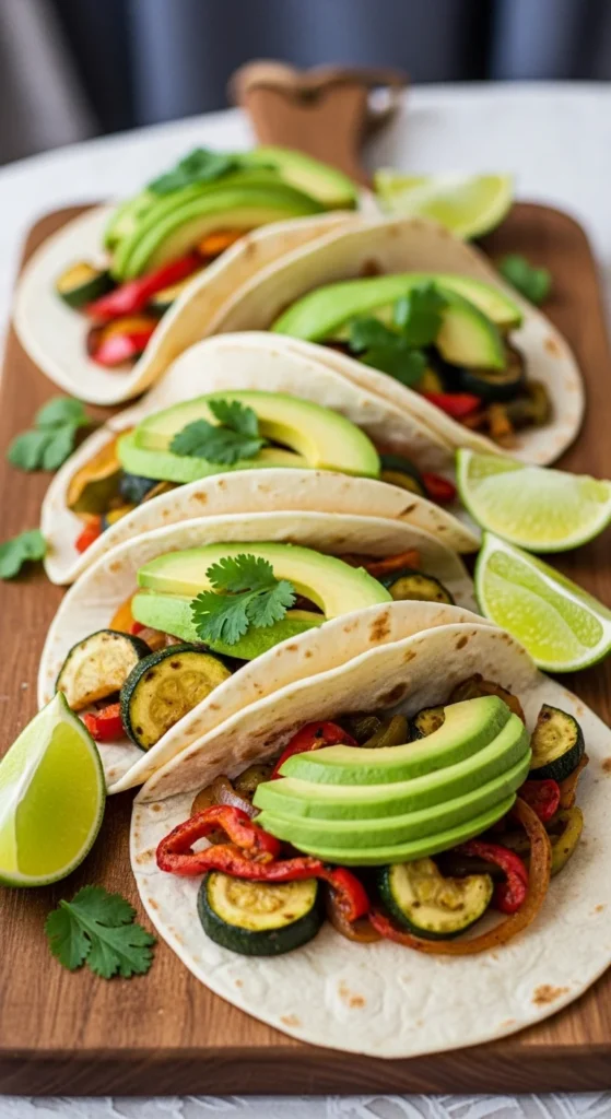 - Fill tortillas with roasted vegetables and avocado.