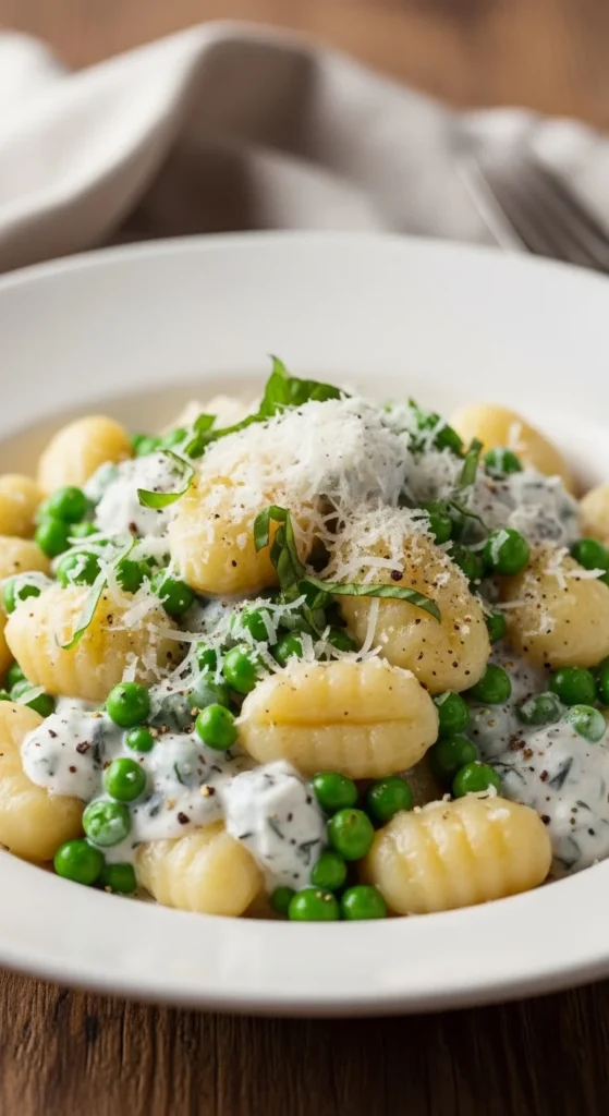 Tender gnocchi with a fresh spring pea and ricotta sauce makes a delightful pasta dish.