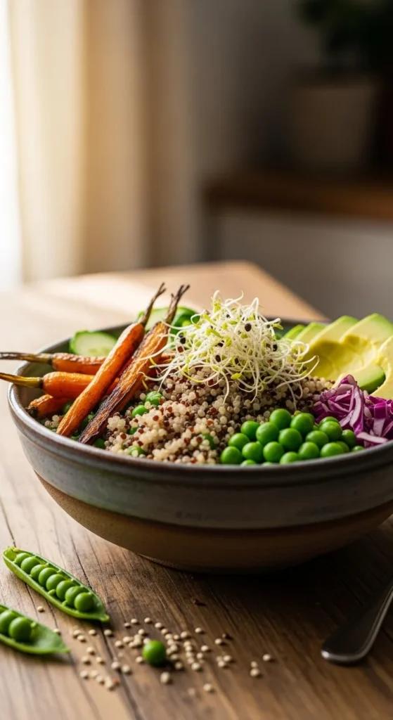 - Top with roasted carrots, peas, and avocado.