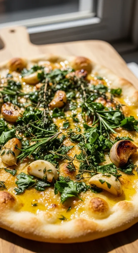 A fragrant flatbread filled with fresh herbs and roasted garlic.