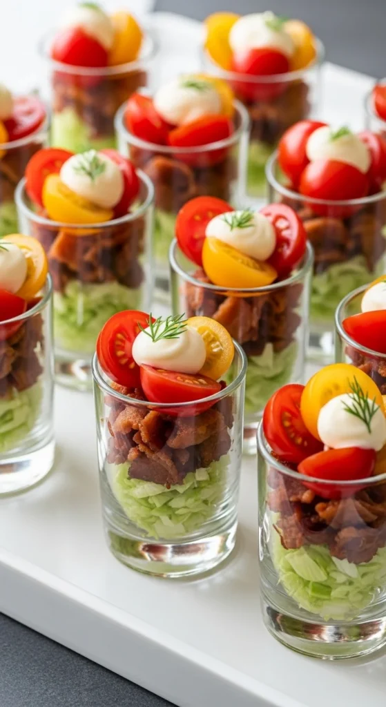 - Layer tomatoes, mozzarella, and basil in small cups.