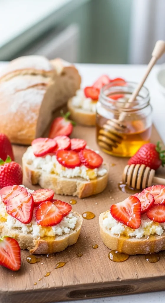 Spread ricotta, add strawberries, drizzle honey.