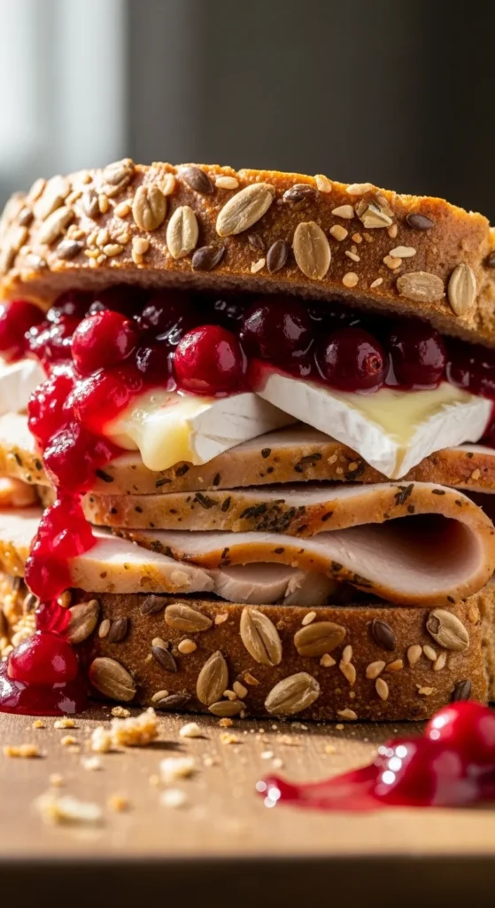 - Layer turkey, brie, and cranberry sauce.