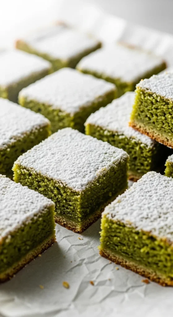 Soft bars with earthy matcha flavor and light coconut sweetness.