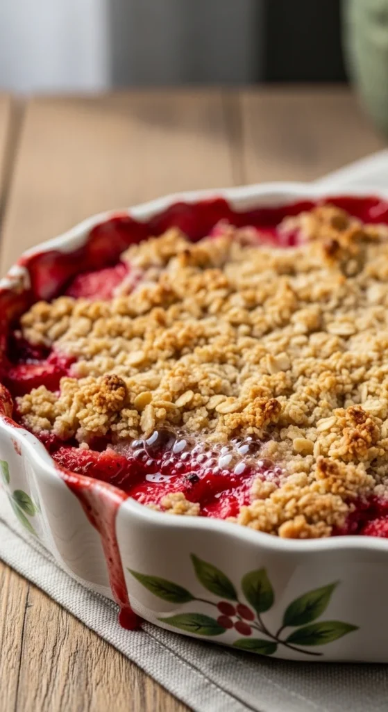 Tart rhubarb balances sweet strawberries with a crunchy topping.
