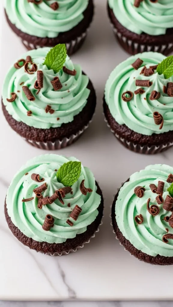 Mint and chocolate combine for a refreshing, festive cupcake.