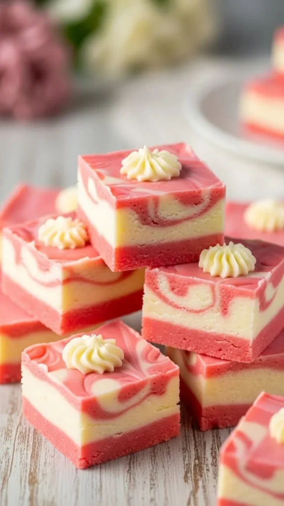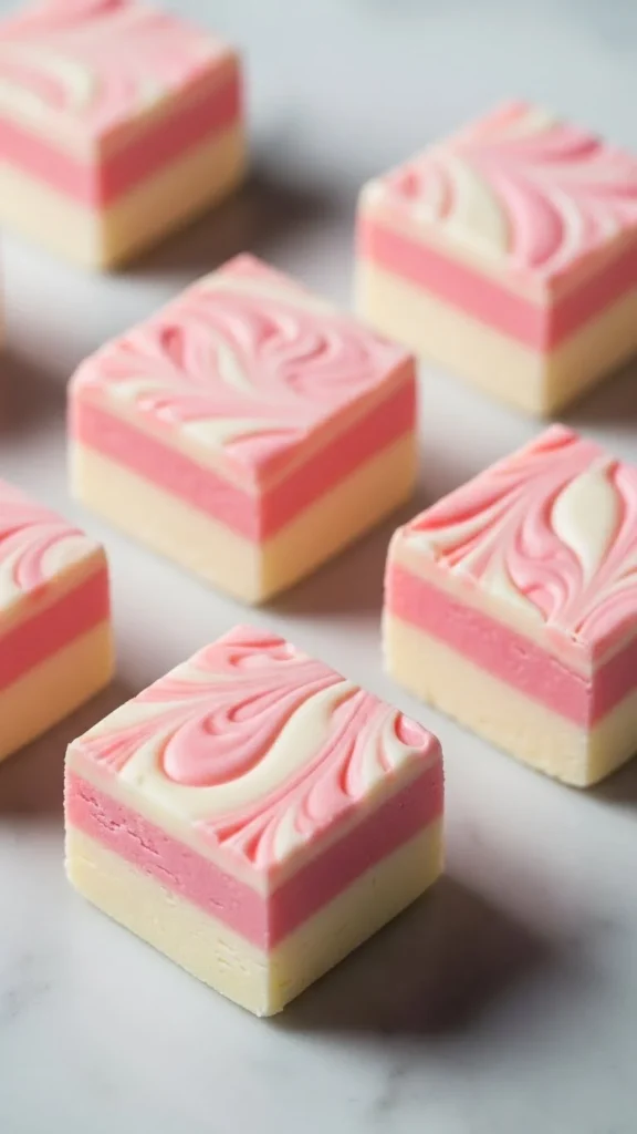 This fudge blends creamy vanilla with sweet strawberry flavor for a festive look.