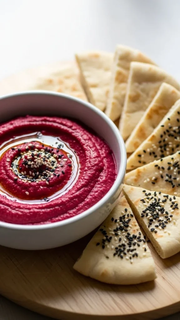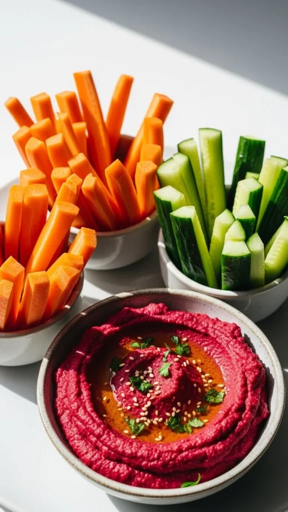 - Blend beetroot, chickpeas, tahini, lemon juice, garlic, and olive oil until smooth.