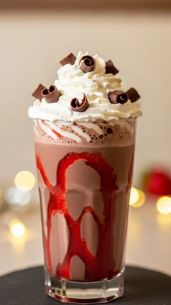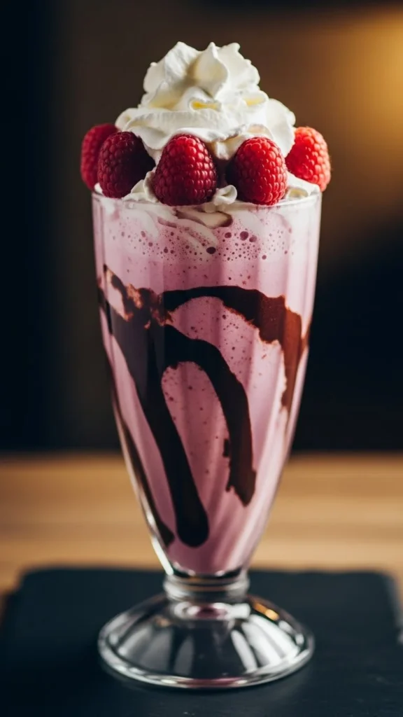 A decadent chocolate shake with a tart raspberry twist, perfect for chocolate lovers.