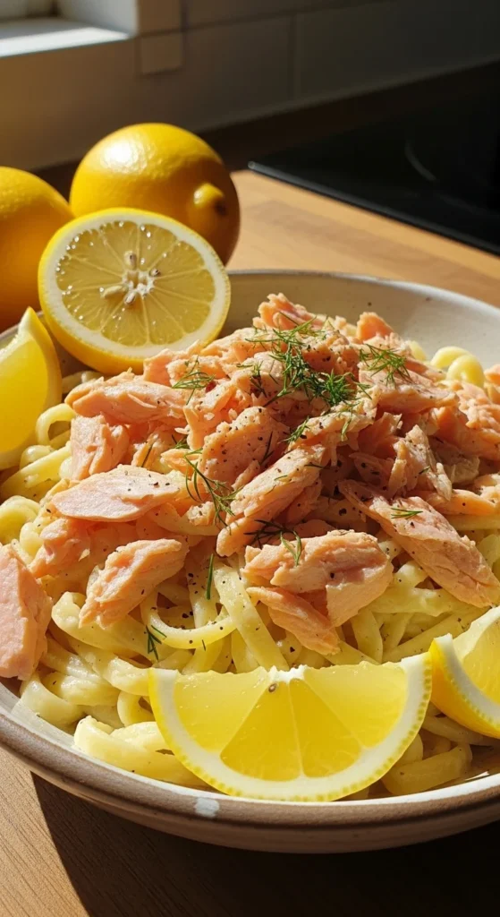 - Flake salmon, mix with pasta.