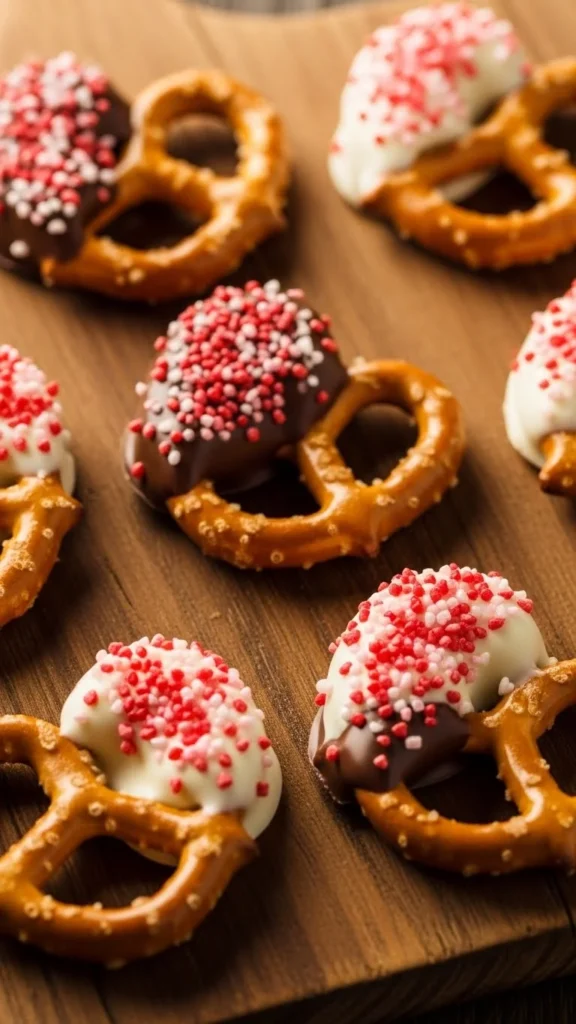 2. Dip half of each pretzel in chocolate, then sprinkle decorations.