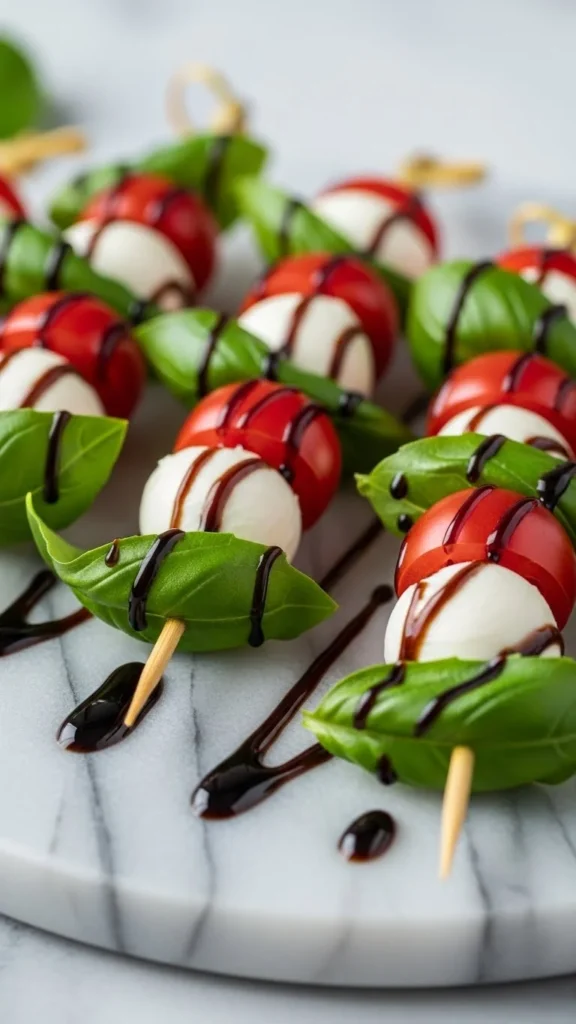 1. Thread a tomato, basil leaf, and mozzarella ball onto each toothpick.